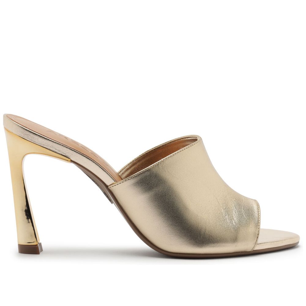 Mule Arezzo Dourada Couro Salto Alto Tira Larga