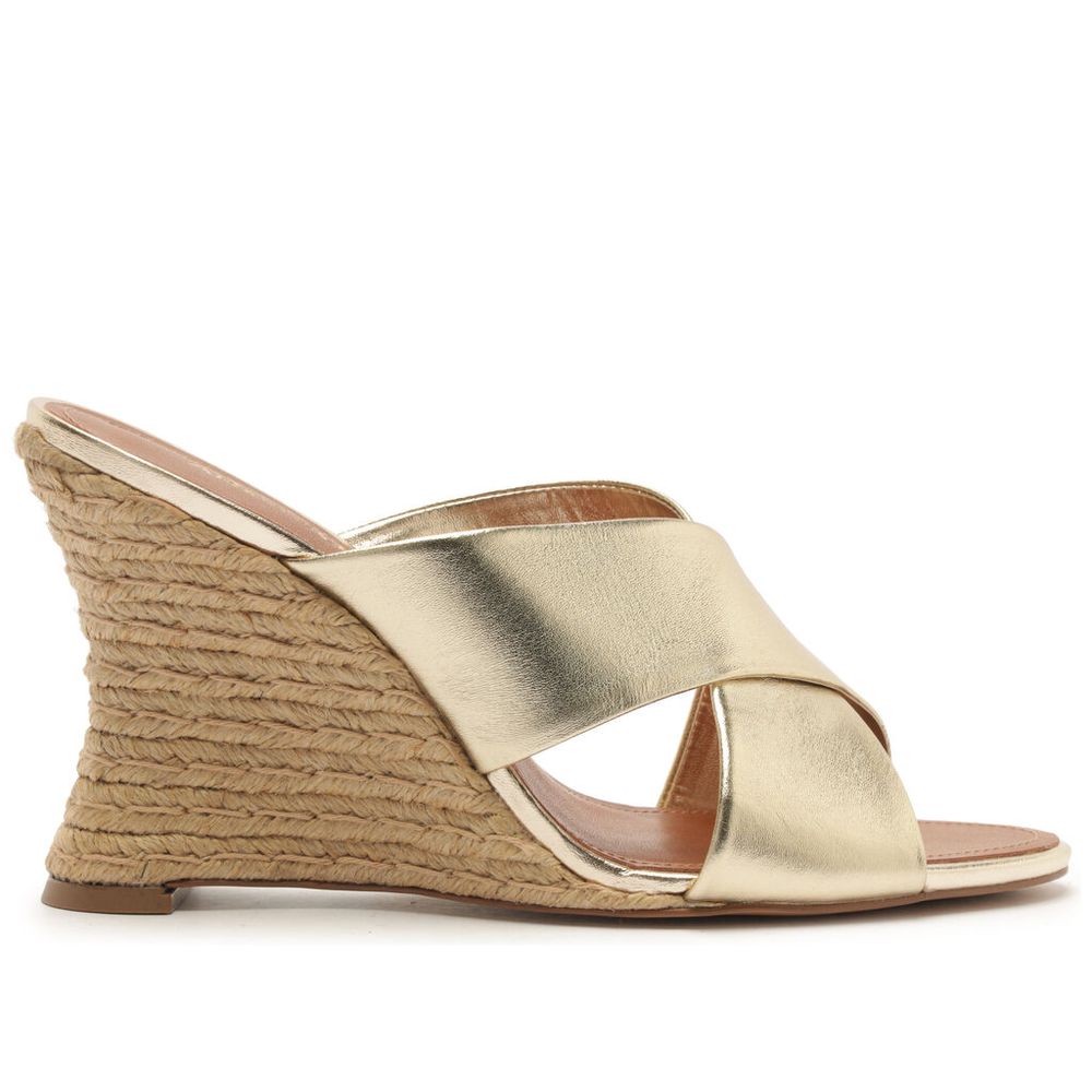 Sandália Arezzo Dourada Couro Anabela Corda Tiras Cruzadas Metalizadas