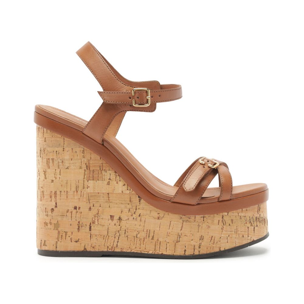 Sandália Arezzo Marrom Couro Plataforma Cortiça Fivelas