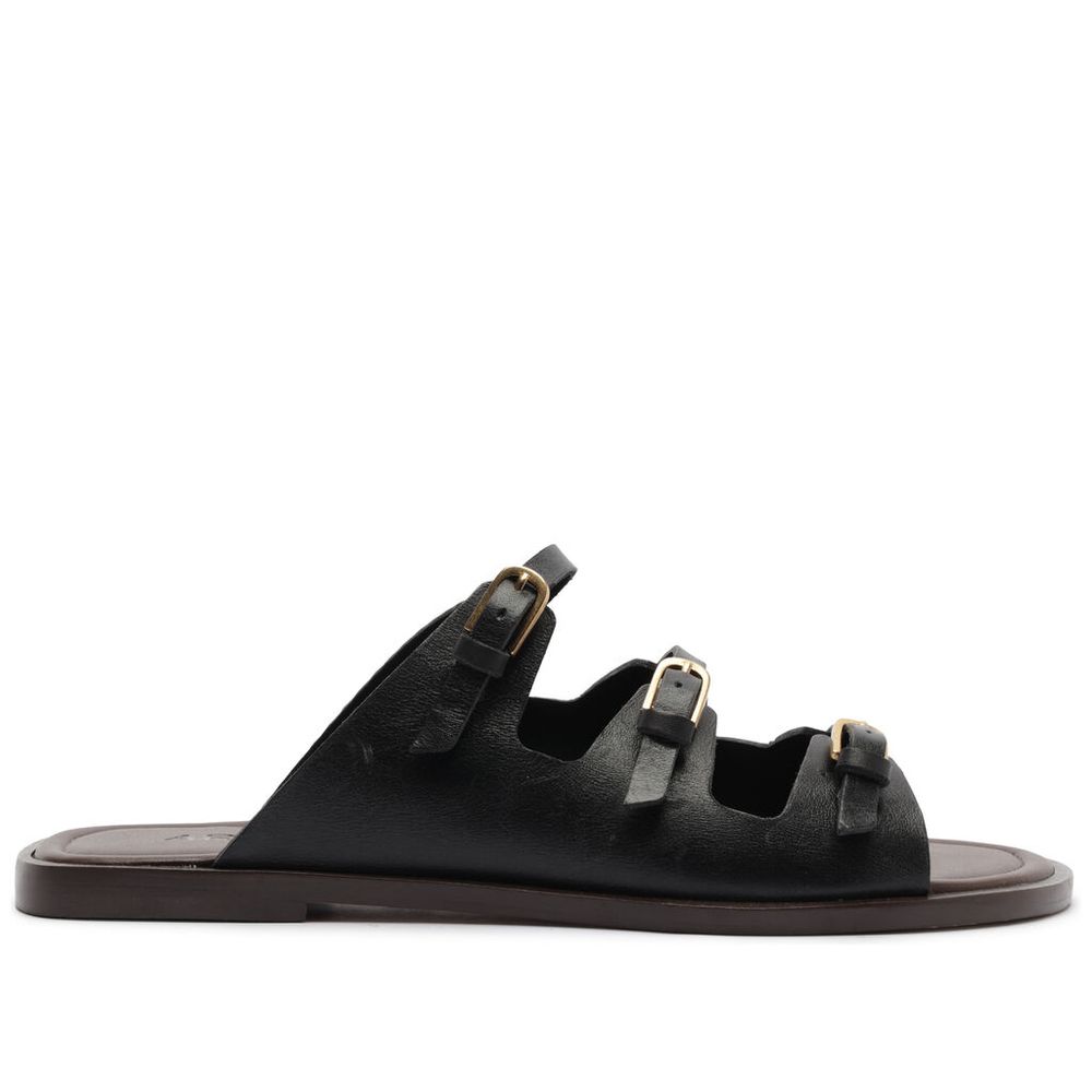Sandália Arezzo Rasteira Preta Couro Tiras Fivelas